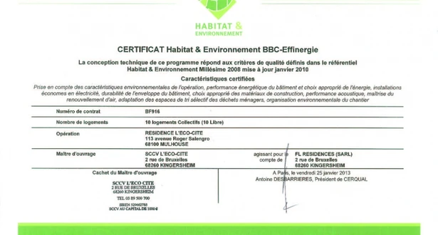 C'est après beaucoup de travail, que toute l'équipe de FL Résidences est heureuse de recevoir la Certification Habitat et Environnement BBC Effinergie délivrée par la CERQUAL.