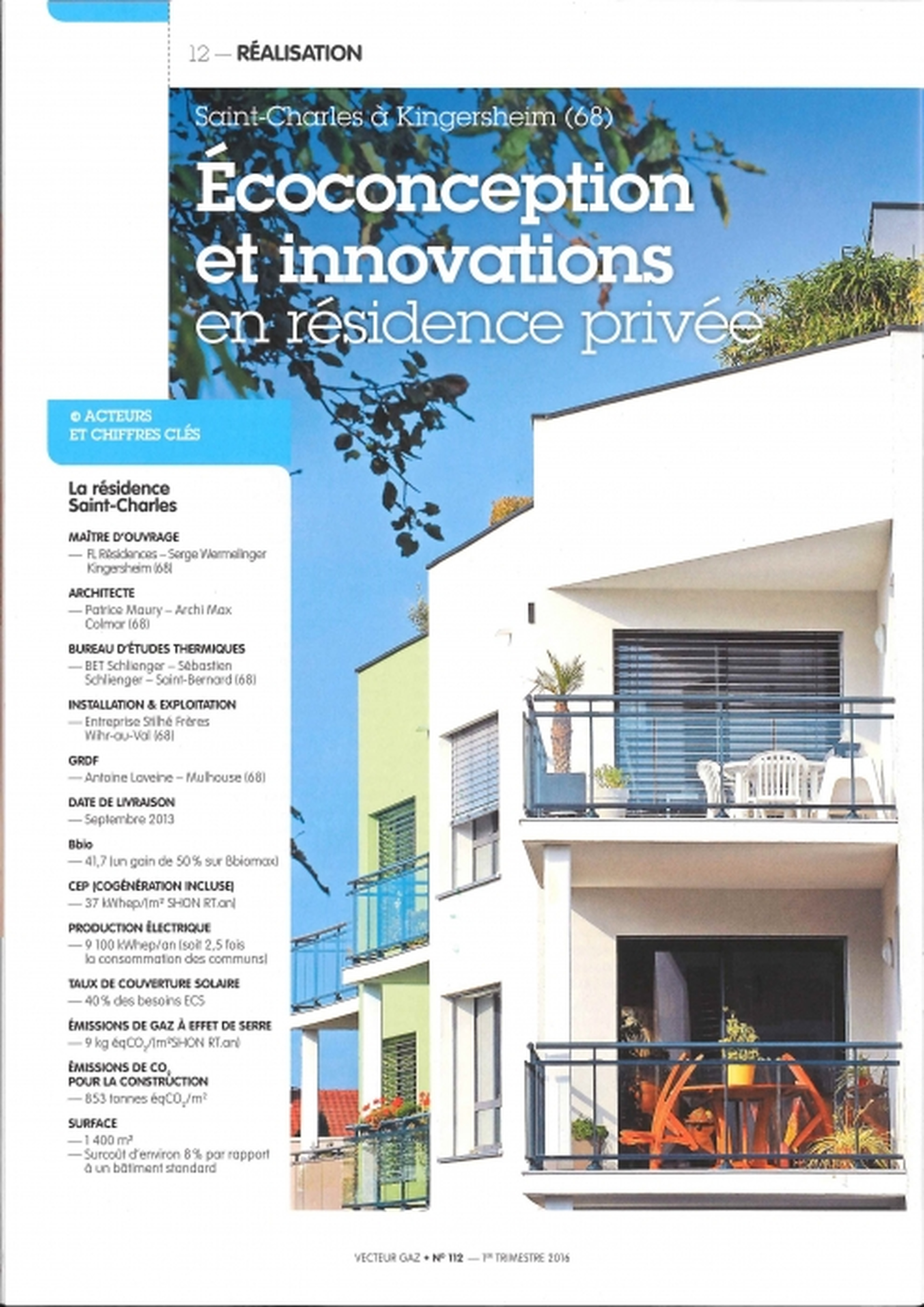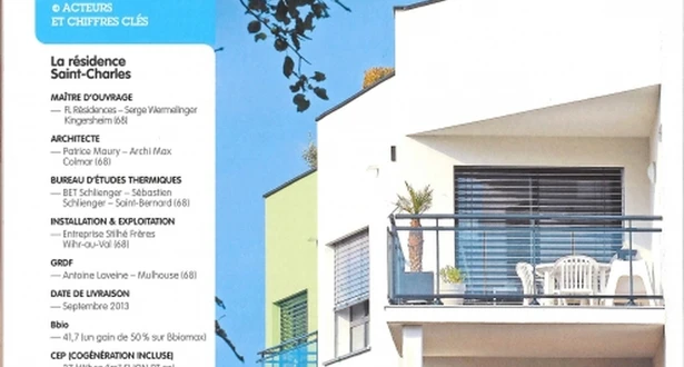 Près de Mulhouse, la résidence Saint-Charles est le fruit d'une collaboration récurrente entre le fondateur de FL Résidences et le BET Schlienger. Cette résidence privée de 16 logements se distingue par son écoconception : bâti performant, micro-cogénération et solaire thermique. Elle est certifiée Habitat et Environnement BBC (Bâtiment basse consommation) Effinergie.