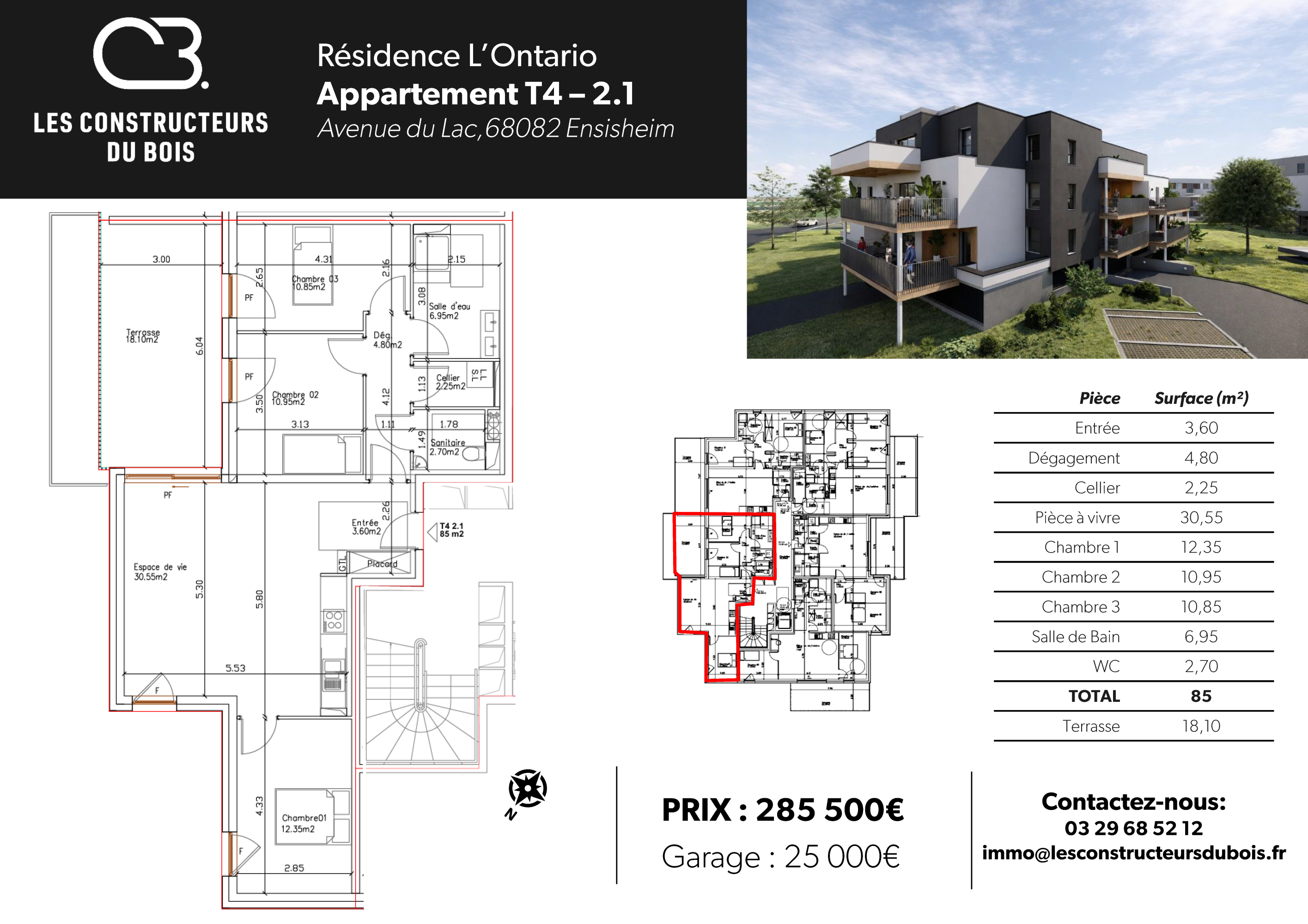 Au premier étage, ce beau 3 pièces possède une terrasse de 23m². Un garage en sous-sol de 37m² pour 2 voitures complète le logement.