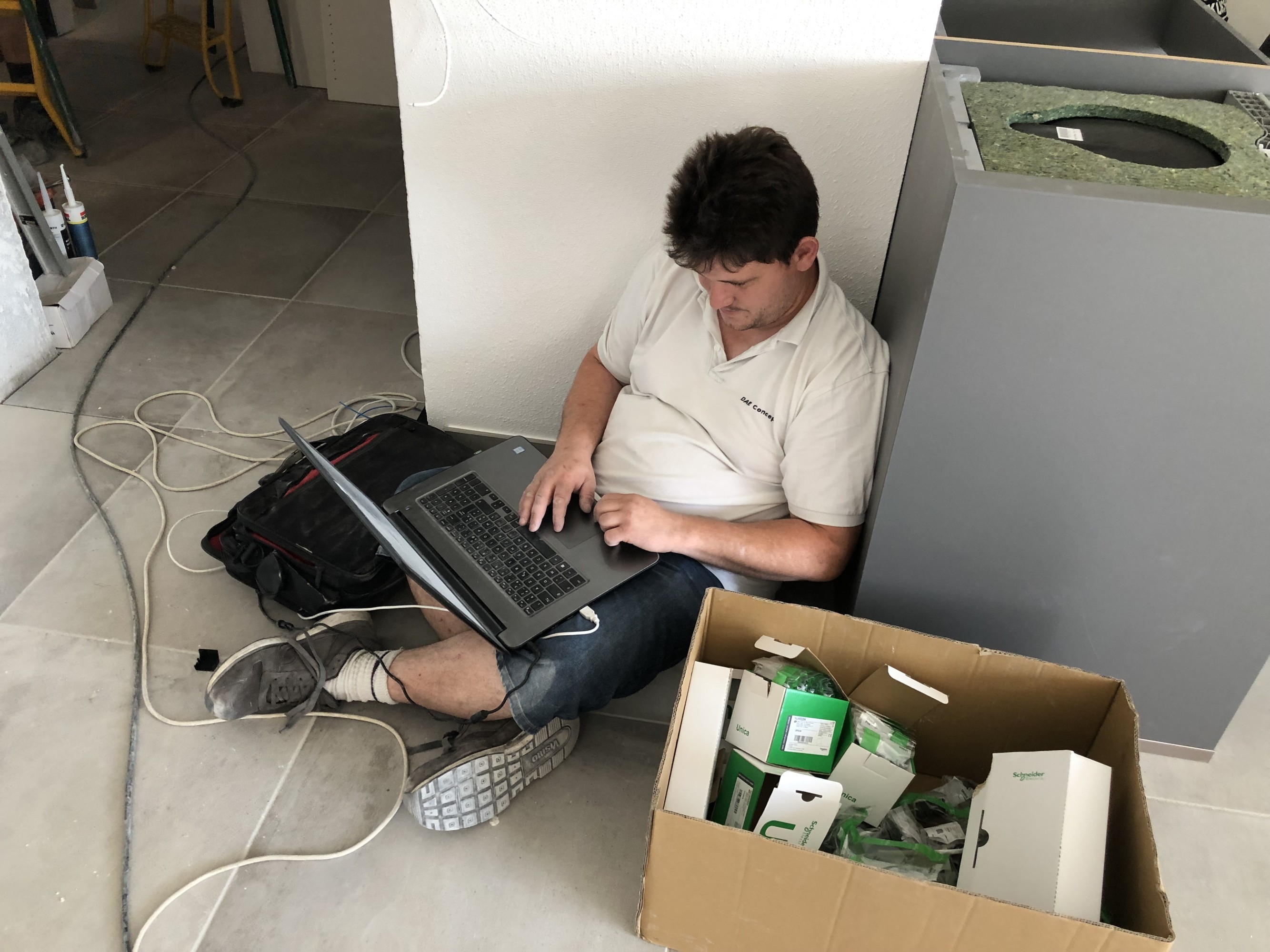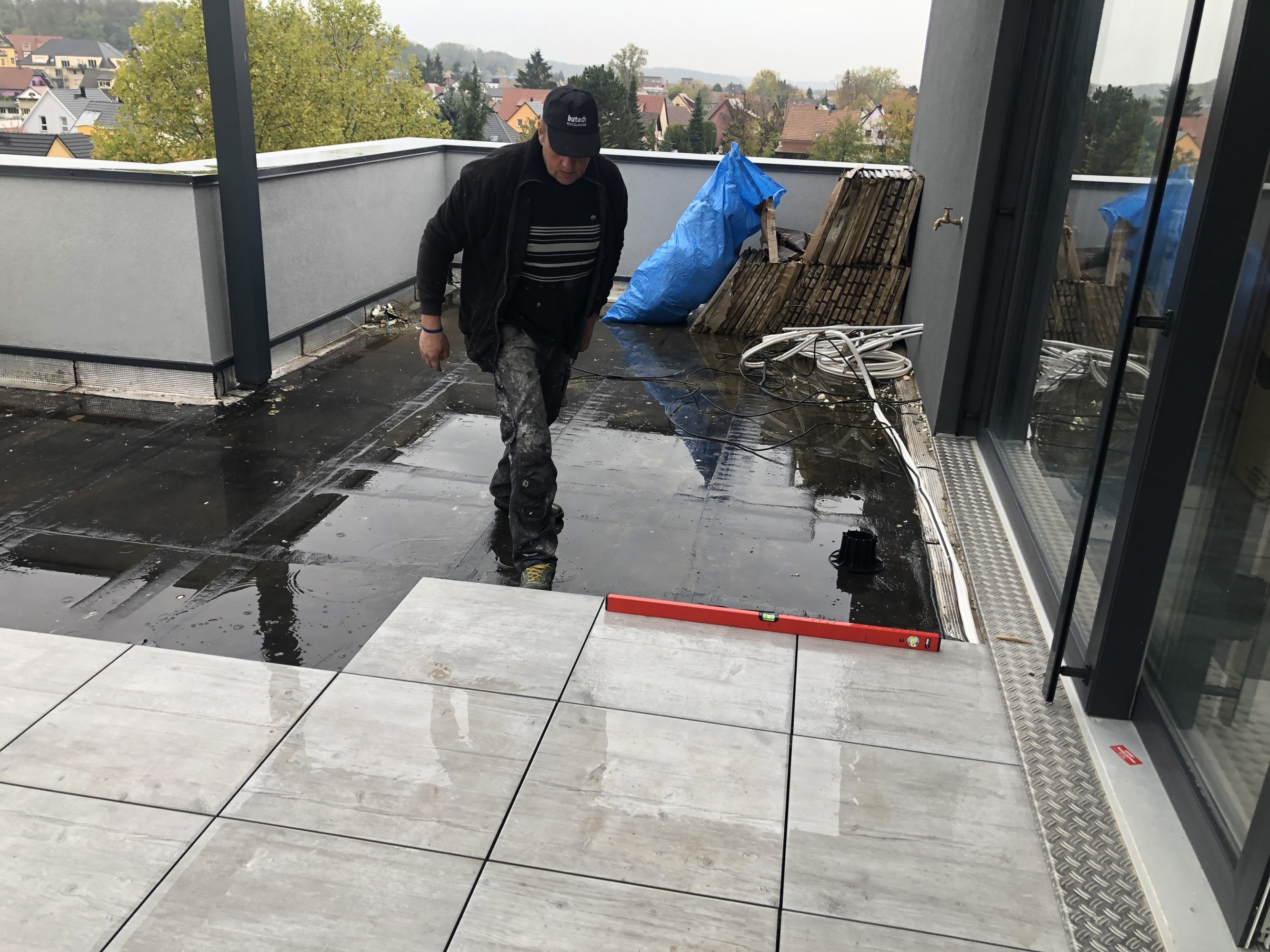 Notre maître carreleur à l'oeuvre pour de la pose de grands carreaux (2,5m)